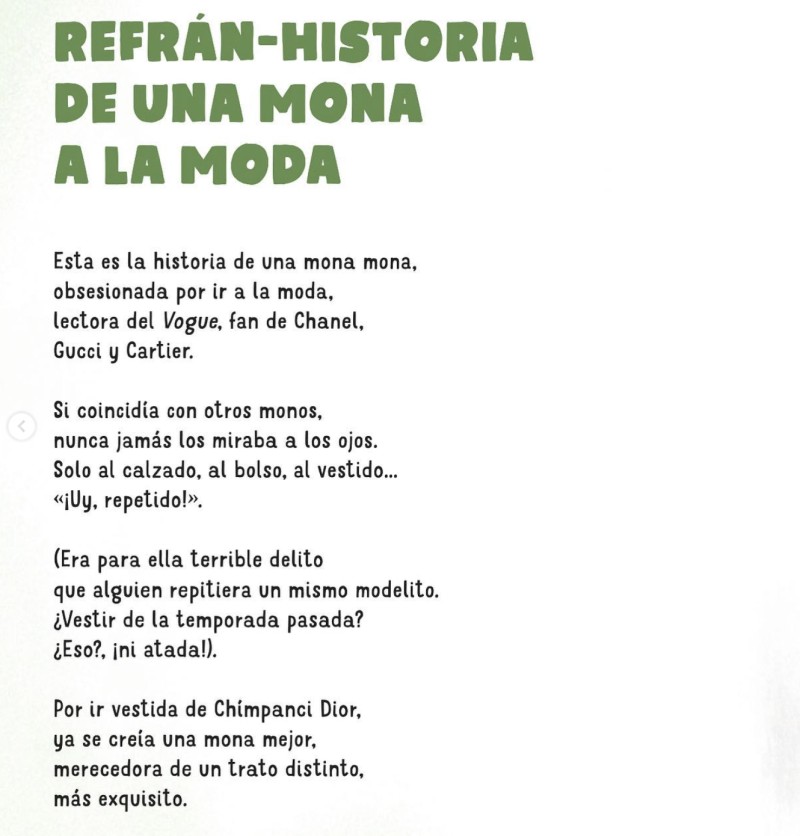 He convertido los refranes en moralejas de pequeñas historia en verso. En el libro hay eso —refrán-historias— y adivinanzas y trabalenguas. Algunos son un homenaje a textos populares, pero todos son inventados y muchos, modernos a rabiar. Diría que el conjunto me ha quedado divertidísimo, tronchante, si no fuera porque «dime de qué presumes y te diré de qué careces».