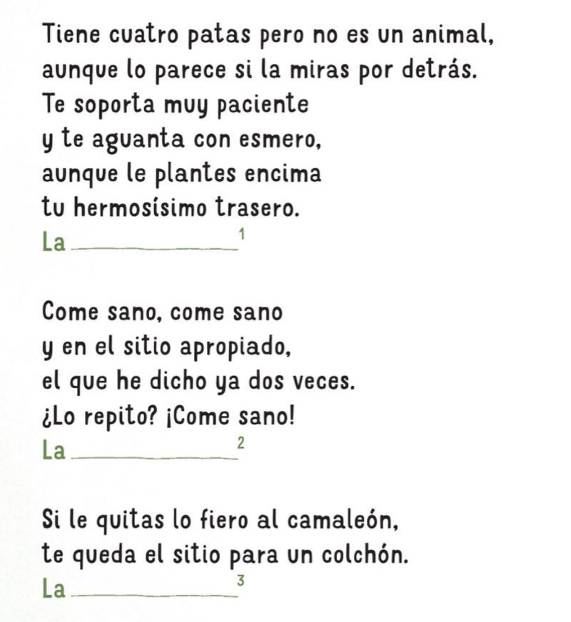 «¿Y si añadimos adivinanzas y trabalenguas?», me sugirieron mis queridas editoras de Molino. La sugerencia fue en sí misma un regalo. ¡Pero si el mejor regalo de Reyes que recuerdo es, siendo muy niña, el 'Adivina adivinanza' de Carmen Bravo-Villasante! (y el libro de 'Los Gnomos', pero esa es otra historia). Me lo pasé pipa inventando adivinanzas (o sea, mirando las cosas por primera vez) y trabucando trastabillante con las letras en mi libretita, en algún lugar del Retiro. Medio libro está escrito en sus bancos.